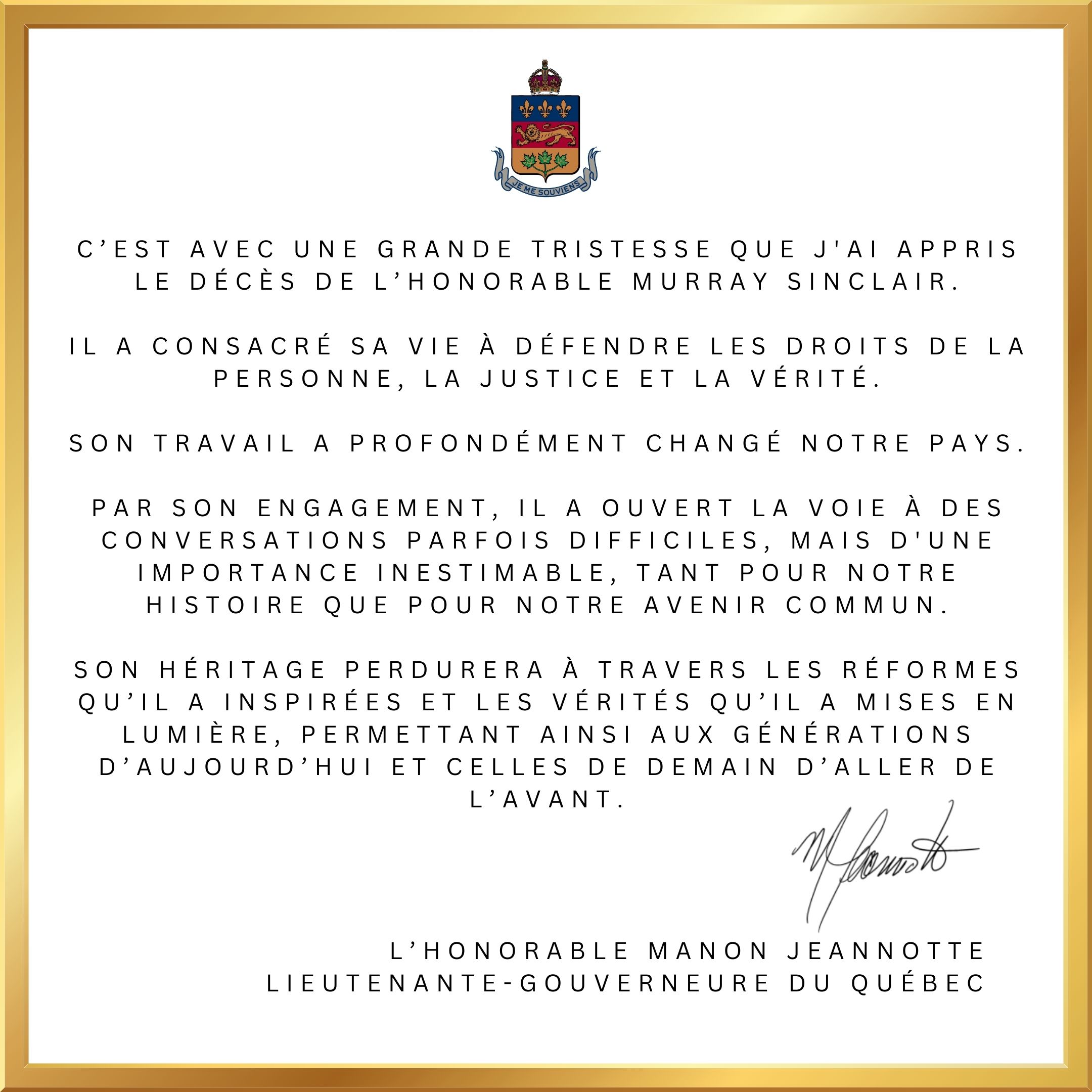C’est avec une grande tristesse que j'ai appris le décès de L’honorable Murray Sinclair.