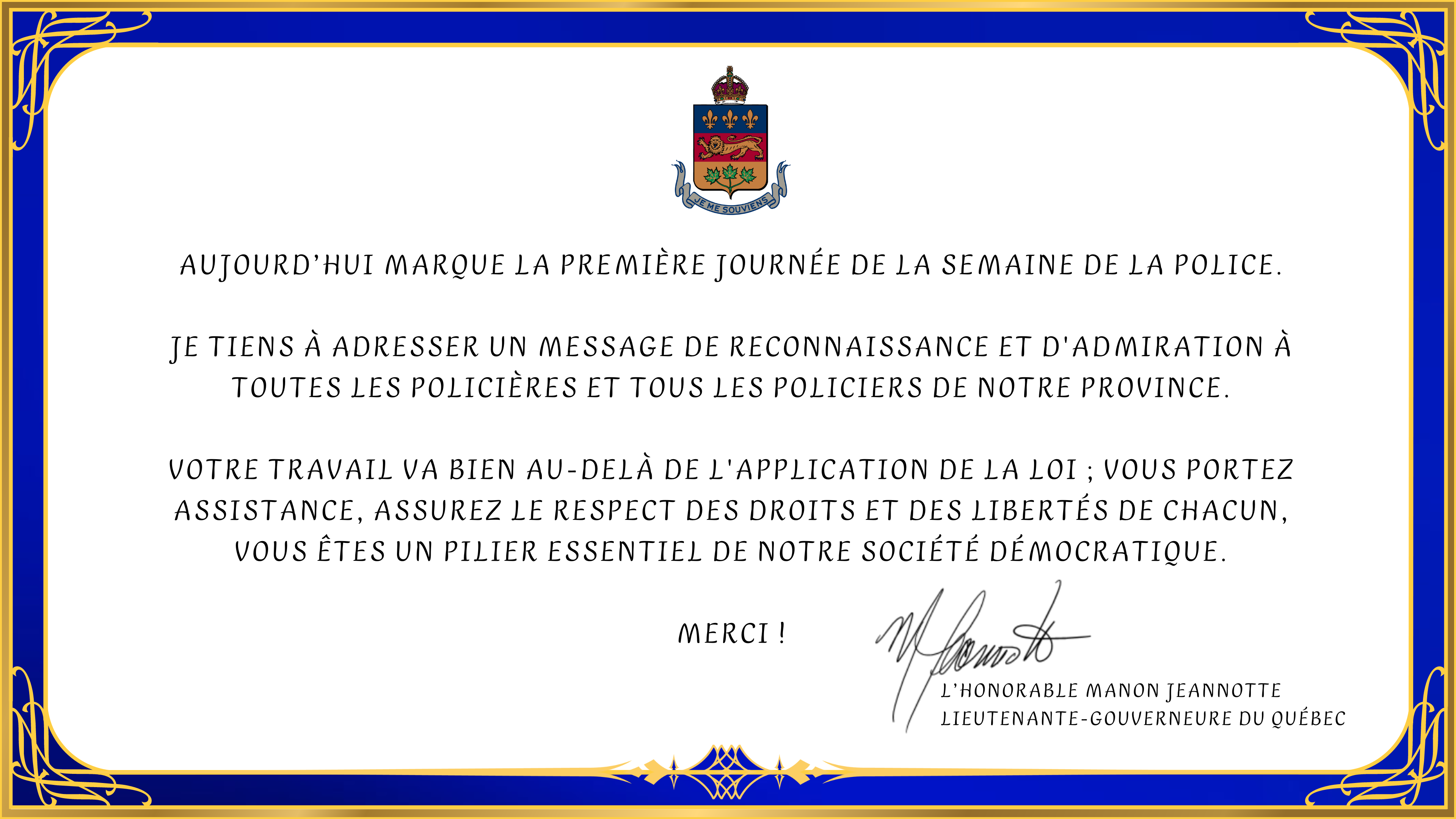 Je tiens à adresser un message de reconnaissance et d'admiration à toutes les policières et tous les policiers de notre province.